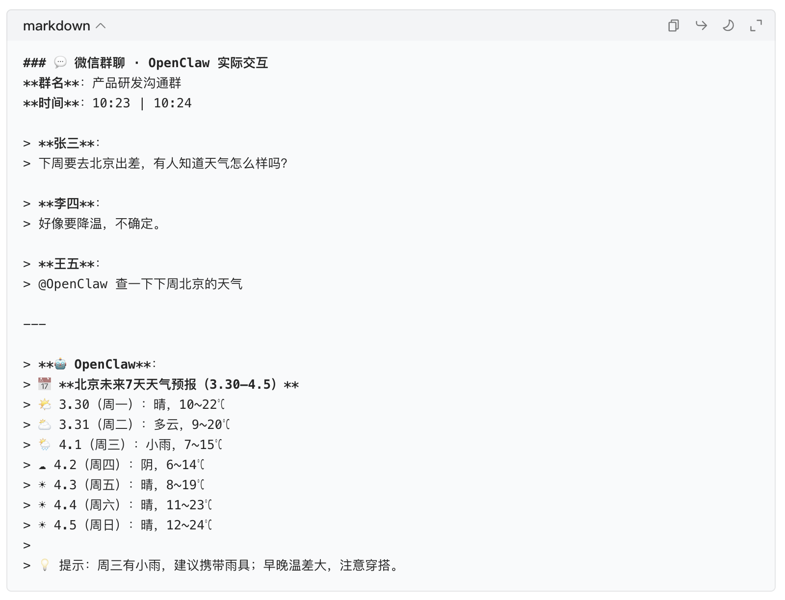 你不需要打开一个新的AI对话框,不需要切换App,不需要复制粘贴。你在微信群里@一下它,它就开始干活。
