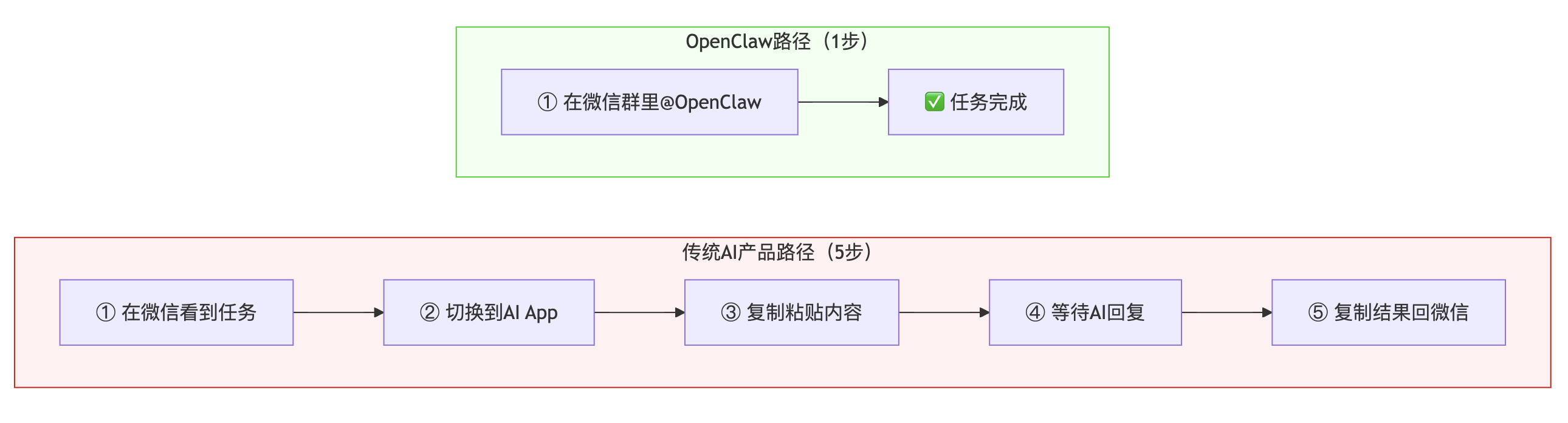 用户想用AI帮他处理微信里的消息,他需要先打开OpenClaw App,把消息内容粘贴进去,等待回复,再回到微信发出去。每次操作,至少5步,切换2个App。
