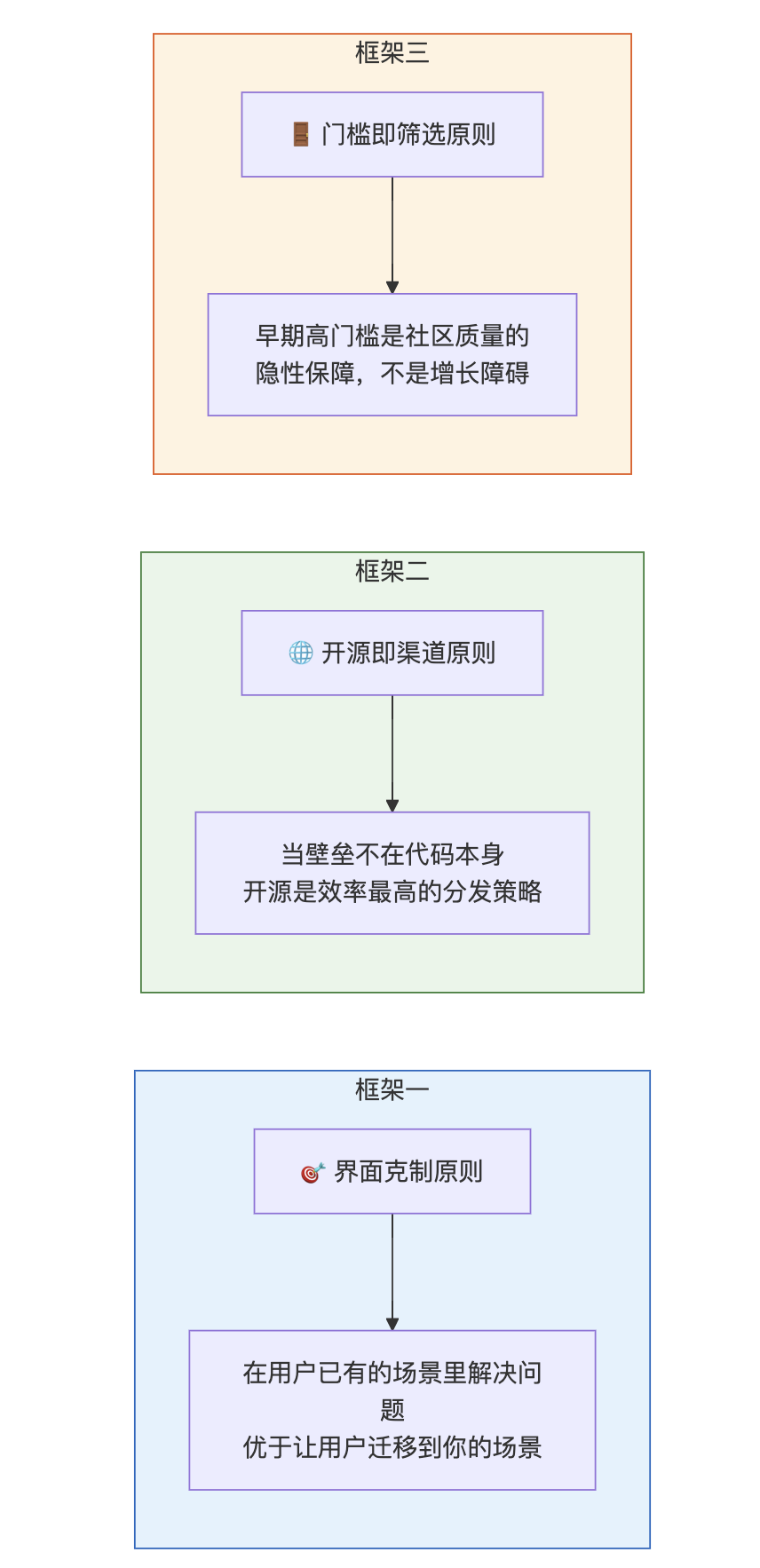 怎么用:在判断一个产品要不要开放时,先想清楚你的护城河究竟在哪里。如果核心壁垒是数据、是生态、是品牌心智,那么保护代码的意义就很有限——你保住了代码,但失去了让别人帮你建生态的机会。