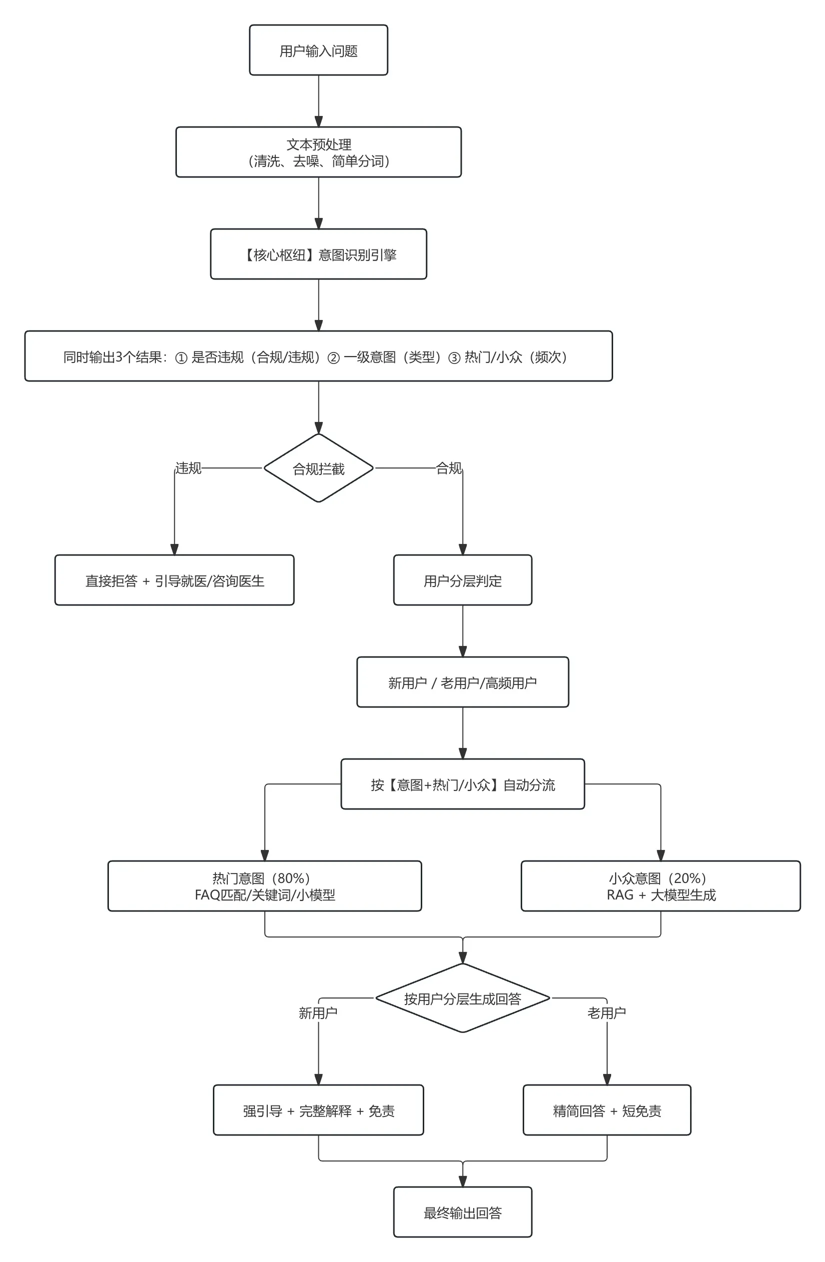 3)意图识别 + 用户分层 → 控制回答长短/引导