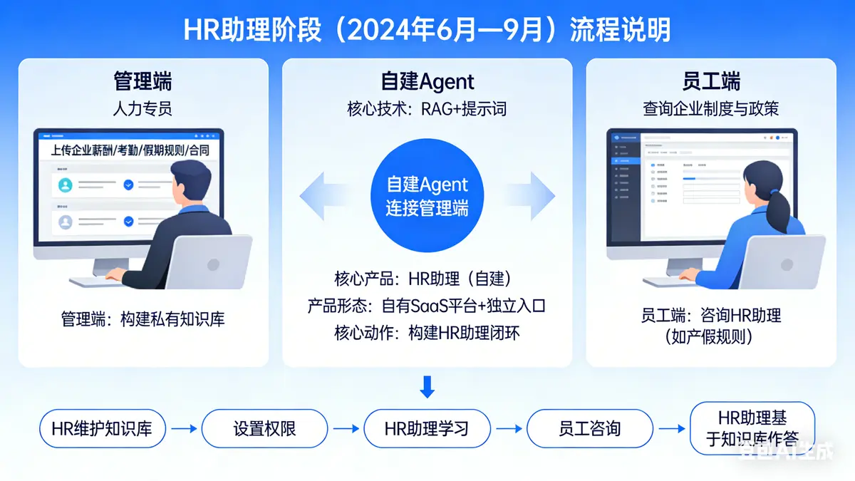 使用角色:人力专员、员工 核心技术:RAG+提示词 核心产品:HR助理(自建) 产品形态:自有SaaS平台+独立入口 核心动作:通过自建Agent,为管理员和员工构建完整的HR助理闭环。管理端支持上传企业薪酬、考勤、假期规则、合同等,构建私有知识库;员工端可查询企业制度与政策。 核心场景:HR在电脑端维护知识库,设置权限,让HR助理学习;员工对企业制度有疑问(如产假规则)时,直接咨询HR助理,由后者基于知识库作答。