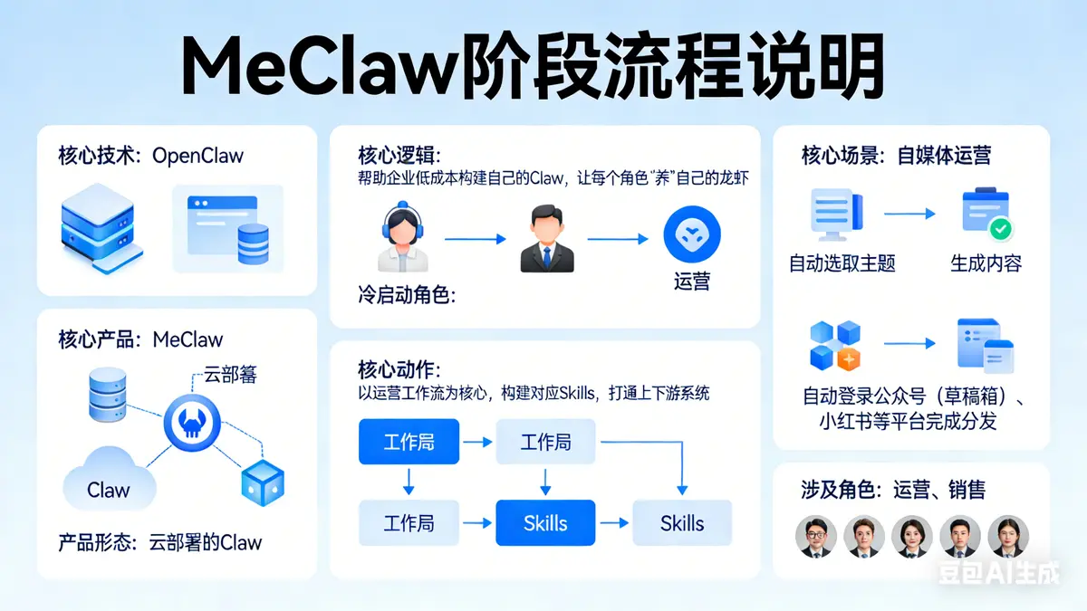 使用角色:运营、销售等 核心技术:OpenClaw 核心产品:MeClaw 产品形态:云部署的Claw 核心逻辑:帮助企业低成本构建自己的Claw,让每个角色都能“养”自己的龙虾,冷启动角色以运营为主。 核心动作:以角色(如运营)的工作流为核心,构建对应Skills,打通上下游系统。 核心场景:以自媒体运营为例,“龙虾”可自动选取主题、生成内容,自动登录公众号(草稿箱)、小红书等平台完成分发。