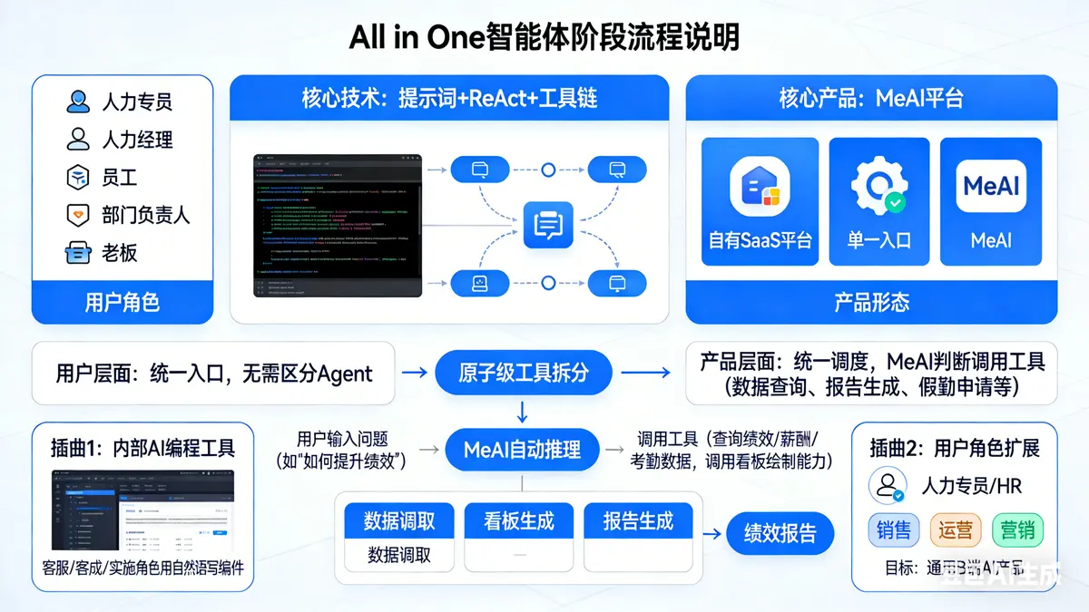 使用角色:人力专员、人力经理、员工、部门负责人、老板 核心技术:提示词+ReAct+工具链 核心产品:MeAI平台 产品形态:自有SaaS平台+单一入口+MeAI 核心逻辑:用户层面统一入口,无需区分使用哪个Agent;产品层面统一调度,MeAI根据用户输入判断调用哪个工具(数据查询、报告生成、假勤申请等),自动输出结果。 核心动作:将原先独立智能体的能力拆分为原子级工具。例如,数据决策Agent原本将数据调取、看板生成、报告生成封装在一起,现在拆为三个独立能力。 核心场景:用户输入问题(如“如何提升绩效”),MeAI自动推理并调用工具(查询绩效、薪酬、考勤数据,调用看板绘制能力等),最终输出绩效报告。
