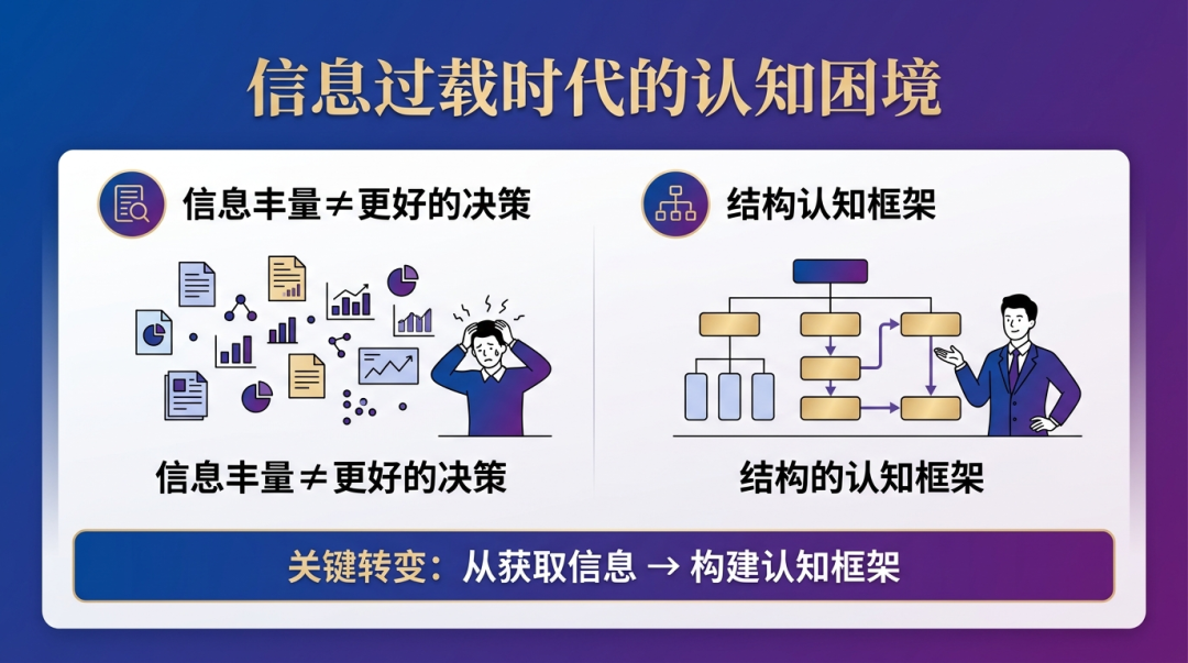 上述方式在信息稀缺时代具有一定合理性,但在信息过载的当下,逐渐暴露出其局限性:信息的丰富性并未转化为决策质量的提升,反而加剧了认知负担与选择焦虑。因此,问题的关键不再是“获取更多信息”,而在于:如何构建一套结构化的认知框架,将信息转化为可推演的决策依据。