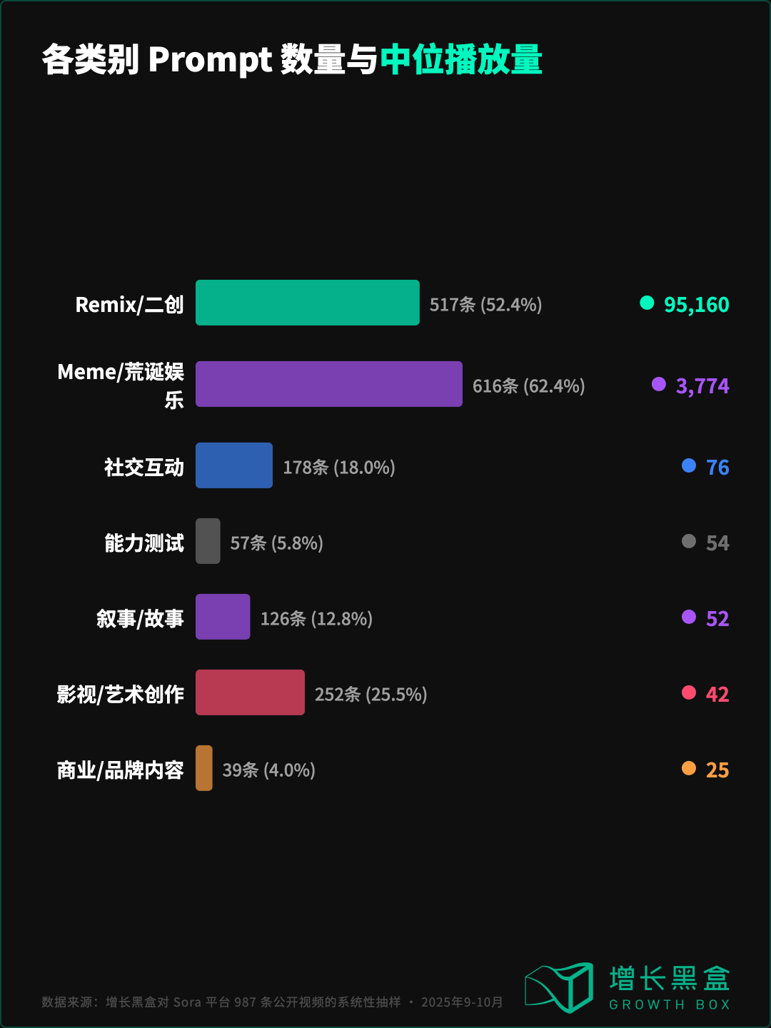 2025年9至10月,Sora 2 用户增长最迅猛的时期,增长黑盒以上千个全球高热度话题和社交媒体关键词为种子,在 Sora 平台上进行了系统性的内容抽样。经过去重和清洗,得到了 987 条独立视频,每一条都附带完整的 prompt 原文、播放量、点赞数、remix 次数等互动数据。