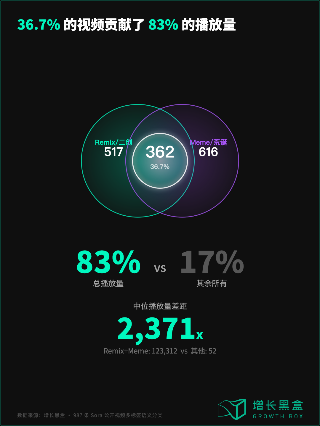 同时带有”Remix/二创”和”Meme/荒诞娱乐”双标签的视频有362条,占总量的36.7%。但这36.7%的内容,贡献了调研样本 83%的总播放量。Remix+Meme 组合的中位播放量是 123,312,其余内容是 52。差距2,371倍。