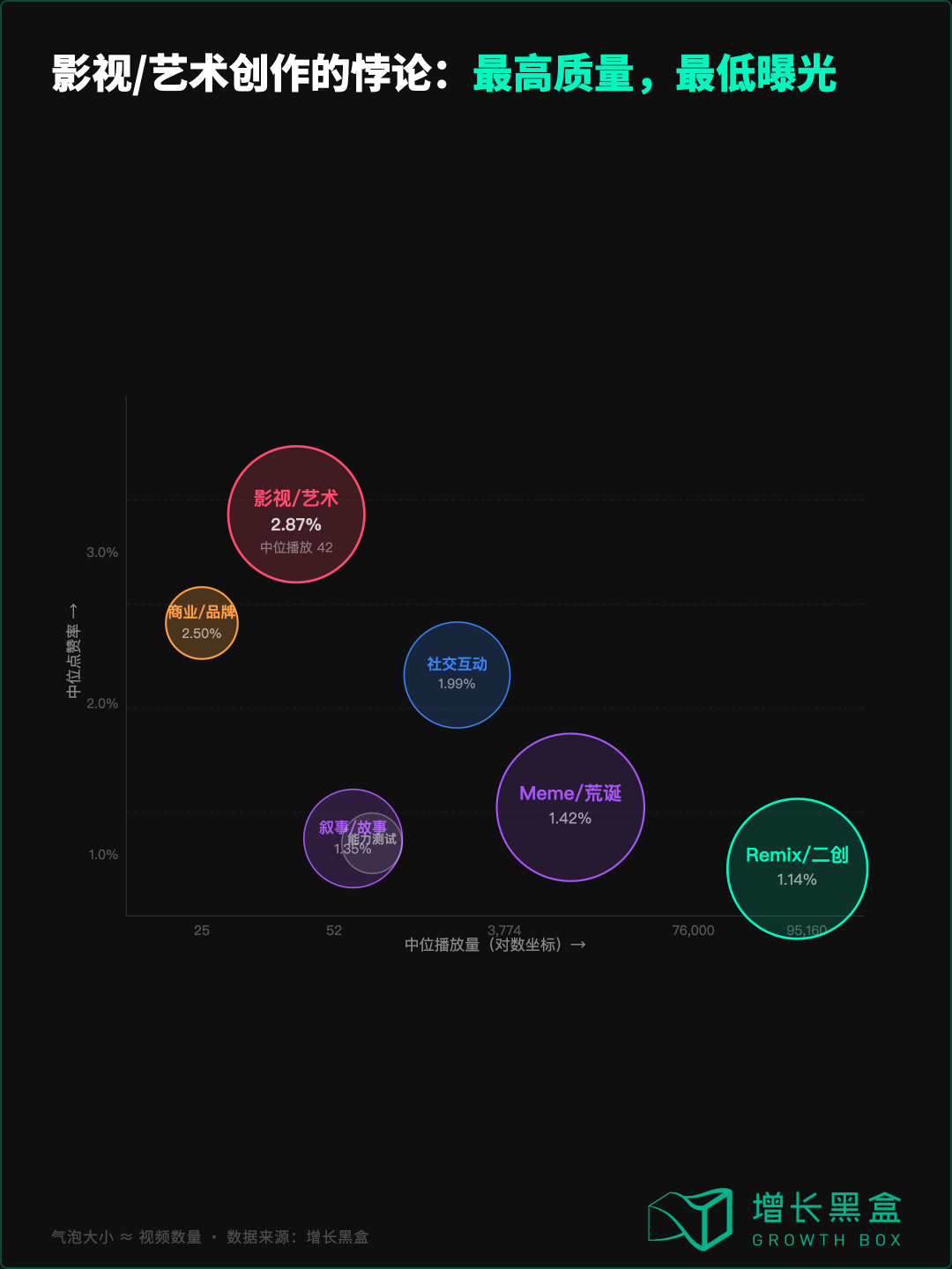 不是。影视/艺术类有252条,占总量四分之一。但它们的处境极其矛盾:影视/艺术类中位点赞率 2.87%,调研样本中最高—远高于 Remix(1.14%)和 Meme(1.42%)。看到的人认可质量。但中位播放量只有 42次,调研样本中最低,71.8%不到数据集中位数。