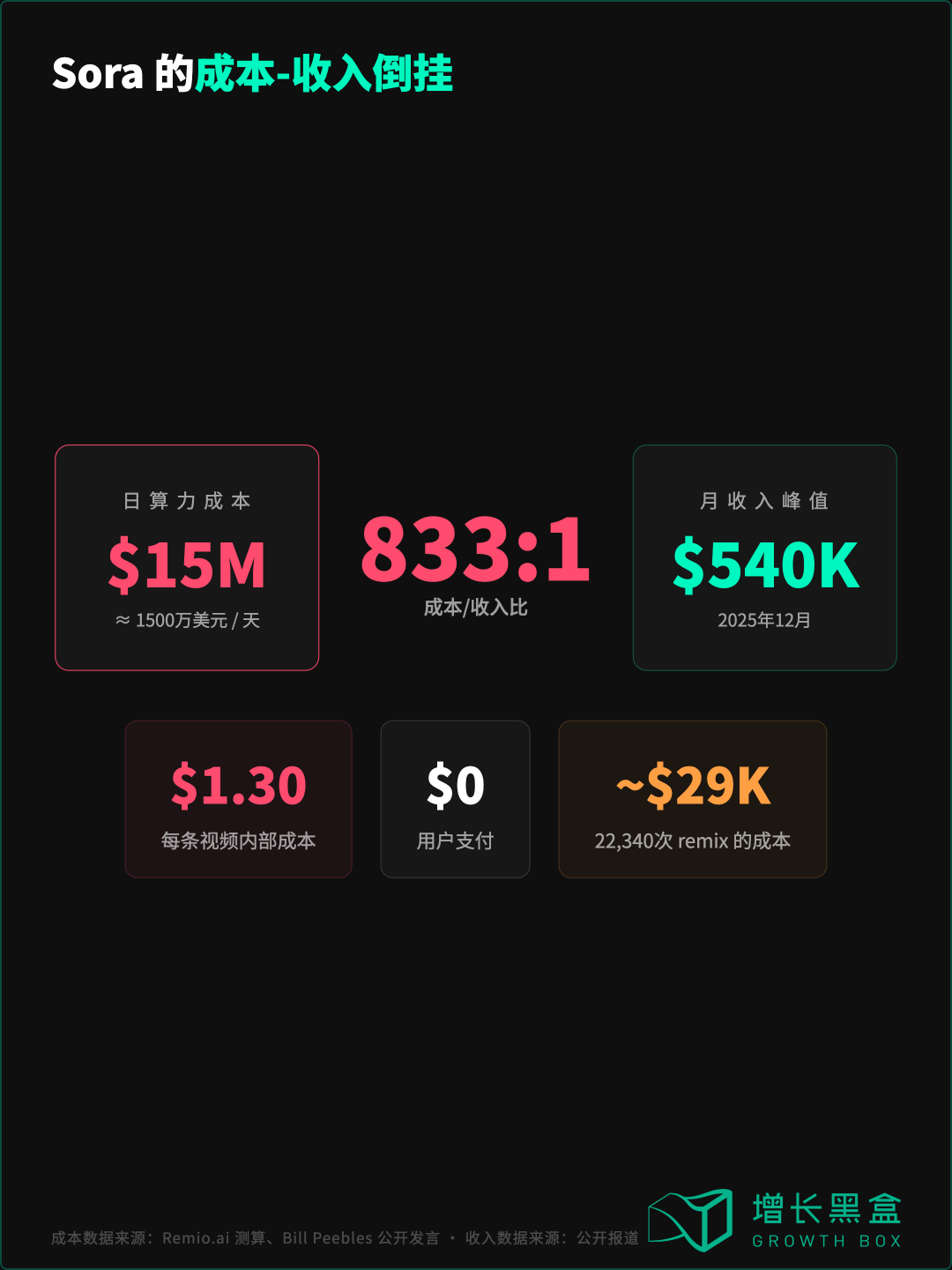 日算力成本约1500万美元,月收入峰值仅54万美元。成本是收入的800倍以上。 每一条被生成的视频OpenAI 都在倒贴$1.30。Sora 研究负责人 Bill Peebles 在2025年10月30日公开承认:”The economics are currently completely unsustainable.” [7]