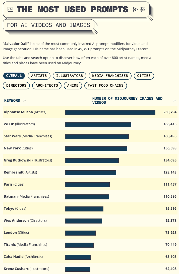 结果显示:Midjourney 用户引用最多的是 Art Nouveau 画家 Alphonse Mucha(23万次)、电影导演 Wes Anderson(9.2万次)、建筑师 Zaha Hadid(6.3万次)。品牌内容同样活跃—仅 McDonald’s 一个品牌就出现在1.8万条 prompt 中。
