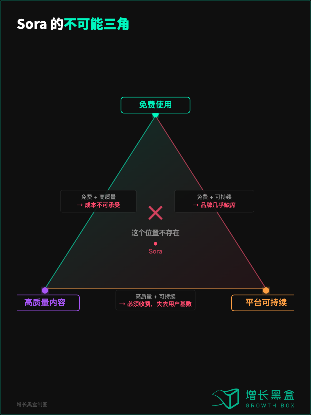 Sora 试图同时实现三件事:免费使用 × 高质量内容 × 平台可持续。但在它的架构下,这三者互相矛盾: