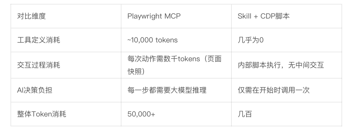 在这个过程中,Playwright MCP的工具定义先吃掉~10,000个token。更可怕的是,每做一次点击,MCP都需要向AI返回当前网页的无障碍树(Accessibility Tree)快照,让AI“看清”页面变化。一个复杂网页的快照动辄几千个token。完成一次发布,AI需要进行七八次交互决策。