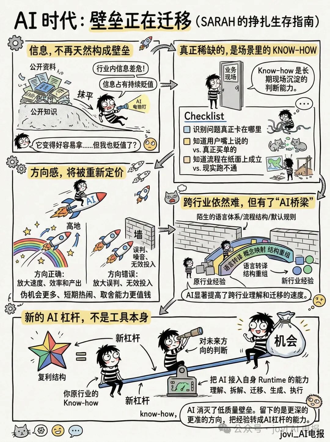 AI时代,信息差正在被快速抹平,真正的竞争壁垒转向行业know-how与跨领域迁移能力。本文深度剖析AI如何重塑价值创造逻辑,揭示从信息占有到经验重构的范式转移,并指出未来核心竞争力在于将行业洞察、趋势判断与AI杠杆的有机结合。