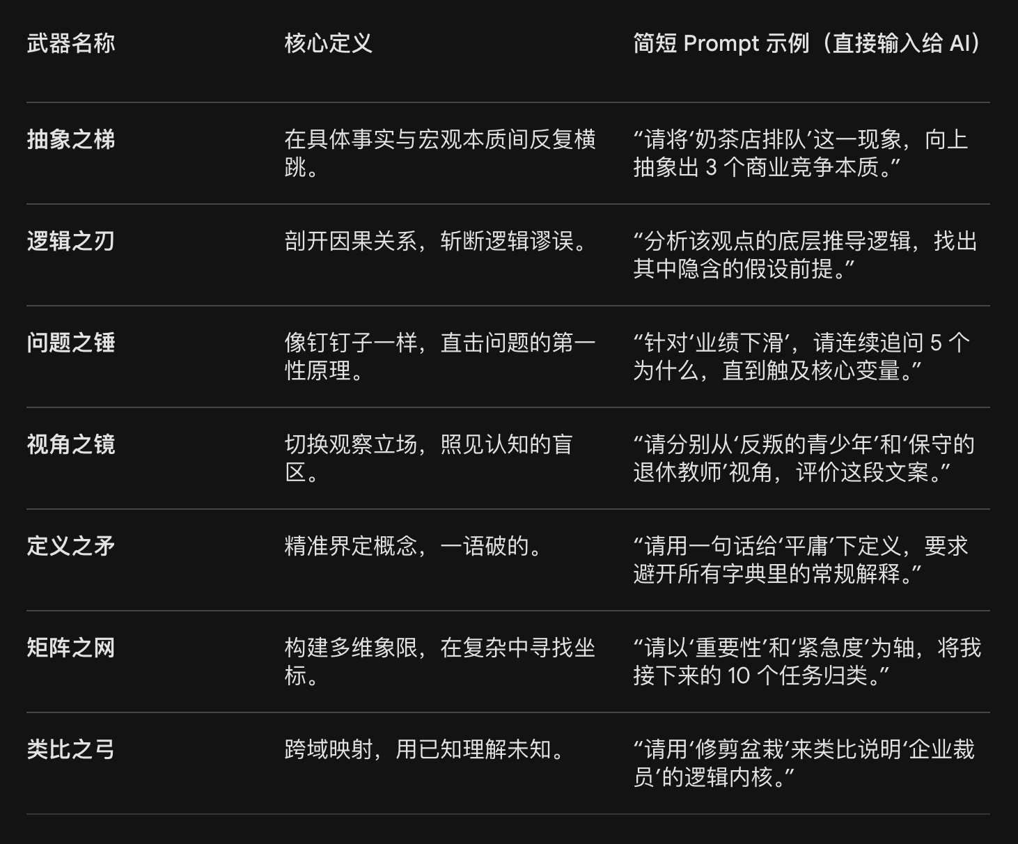 李继刚打造了著名的“思考七武器”:抽象之梯、逻辑之刃、问题之锤、视角之镜、定义之矛、矩阵之网、类比之弓。这并非简单的提示词模板,而是他将经典著作中的思维模型提取本质后的“思考封装”。