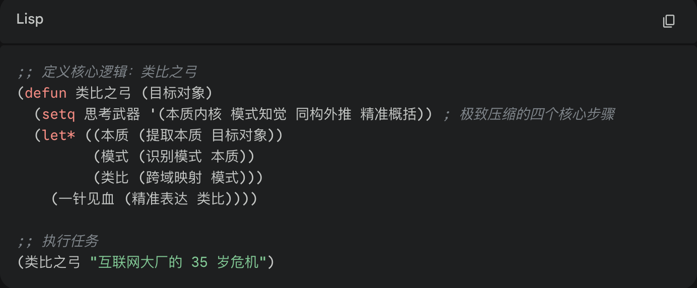 在消失的半年里,李继刚一头扎进了哲学的书海。当他带着全新的作品《汉语新解》王者归来时,人们发现他的风格发生了剧变——从冗长的公文体,变成了极致精简的Lisp伪代码。这种转变的背后,是他构建的三个核心认知工具。