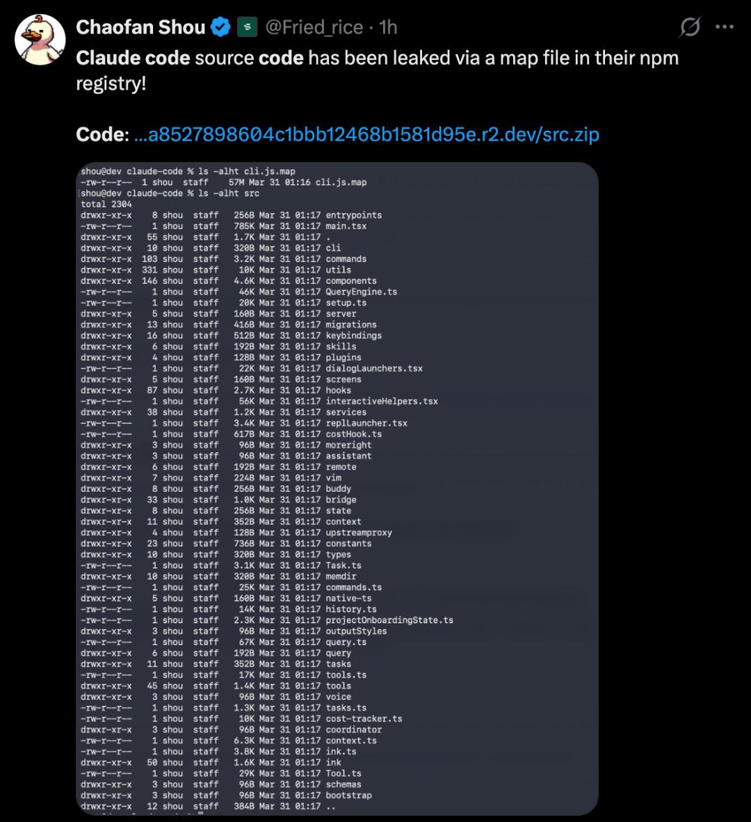 安全研究员Chaofan Shou在X上发出一条简短的帖子:”Claude code source code has been leaked via a map file in their npm registry!”(Claude Code源码已通过npm注册表中的map文件泄露!)随后,整个AI开发者社区进入了一种奇特的混沌状态——一部分人在震惊,一部分人在狂欢,还有一部分人已经在GitHub上飞速开叉,把512,000行TypeScript代码据为己有。