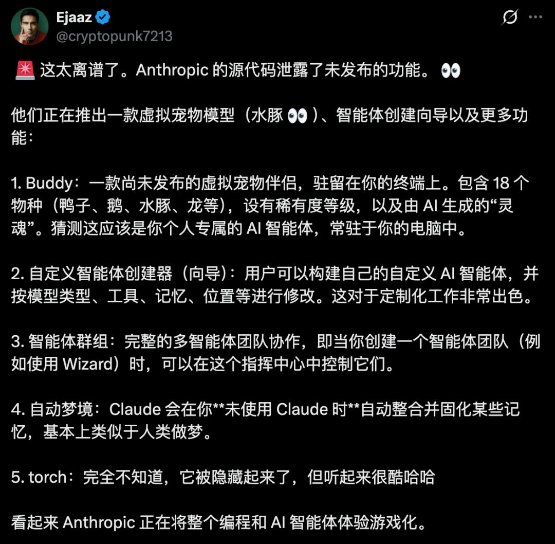 - 未发布功能路线图:源码中甚至藏着一个名为BUDDY的彩蛋——一个类似电子宠物的数字伴侣系统,有稀有度等级、闪亮变体、程序化生成的属性,锁在一个编译时特性标志后面,预定在2026年4月1日至7日进行预告,5月正式发布。