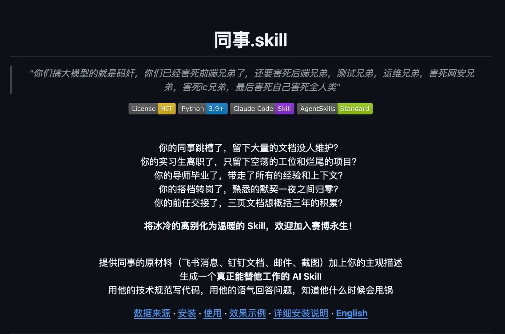 同事.skill 的作者在 README 里写了一句意味深长的话——”将冰冷的离别化为温暖的 Skill”。