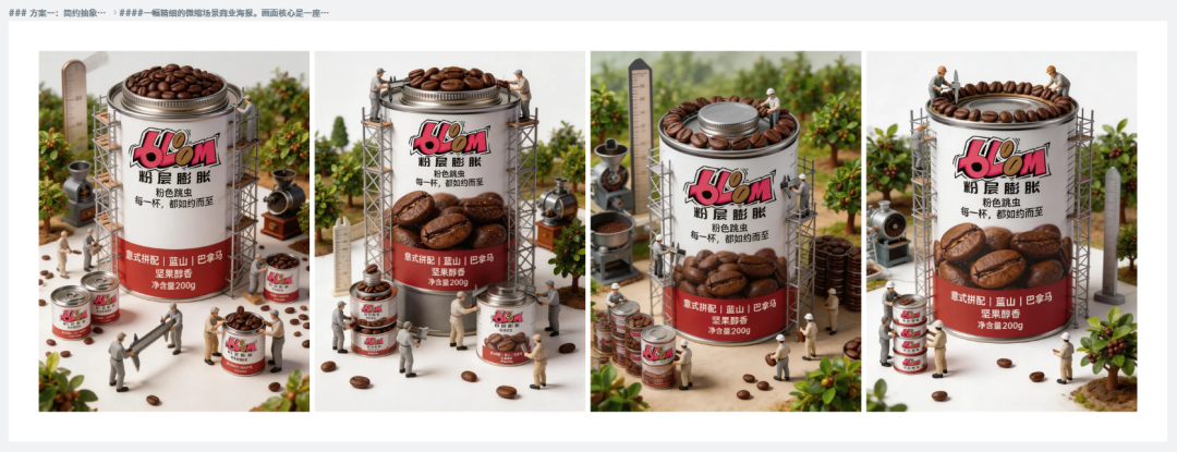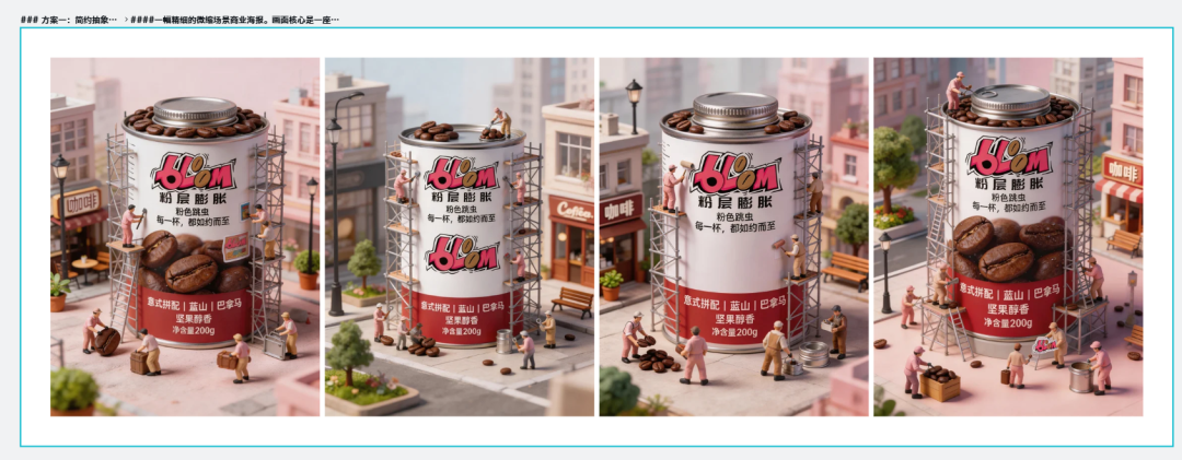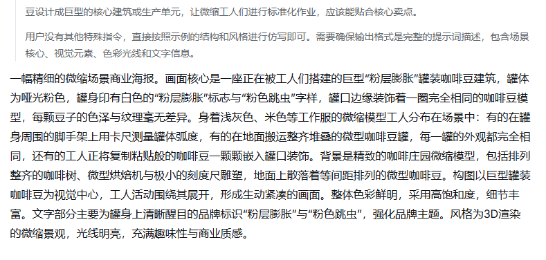 示例:若刷到一张微缩风格的饮料海报,反推提示词后,将“饮料瓶”替换为“粉层膨胀罐装咖啡豆”,“蓝色”替换为“柔粉色”,添加“复制粘贴微型标识”和“工人用卡尺测量”的细节,即可快速生成适配「粉层膨胀」的微缩场景海报。