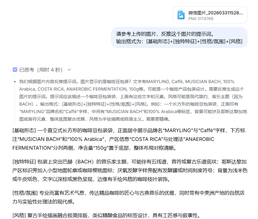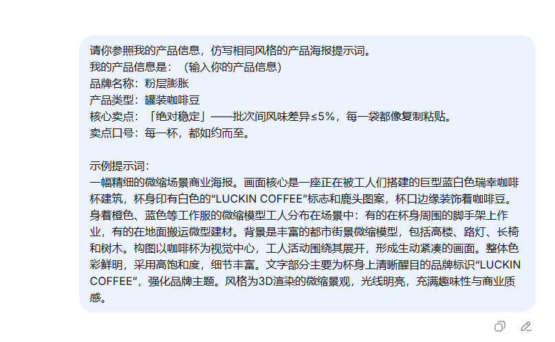 如果觉得自己写提示词太费力,教你一个更简单的方法:直接复制上面的提示词,发给AI(如DeepSeek),要求“参照我的产品信息,仿写包装提示词”,再根据AI生成的内容微调,就能快速得到专业的包装素材。
