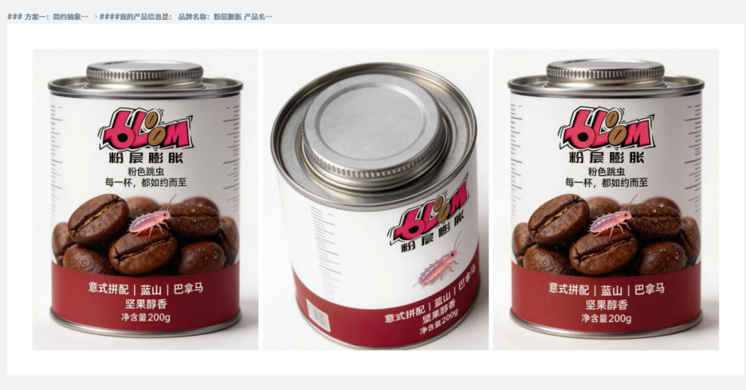 示例提示词:一个圆柱形罐装咖啡豆包装,顶部为银色螺旋盖,正面清晰展示品牌名“粉层膨胀”与产品名“粉色跳虫”,核心卖点「绝对稳定」与具体说明“批次间风味差异≤5%”占据视觉中心,下方规整排列产品信息“意式拼配”、“蓝山”、“巴拿马”、“坚果醇香”及卖点口号“每一杯,都如约而至”,底部标注净含量“150g”,布局逻辑清晰、重点突出。……