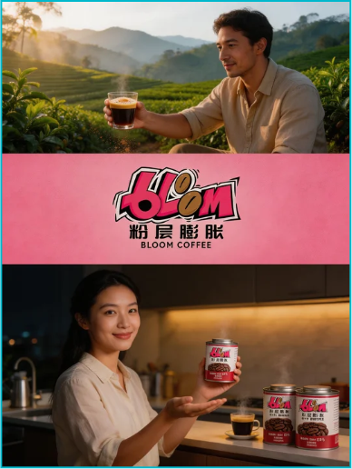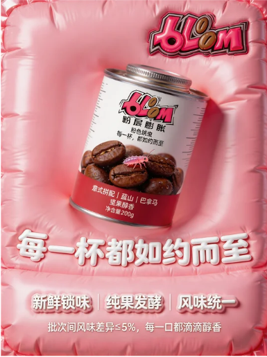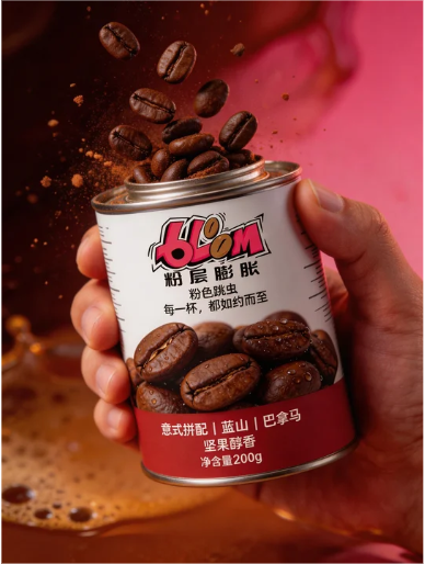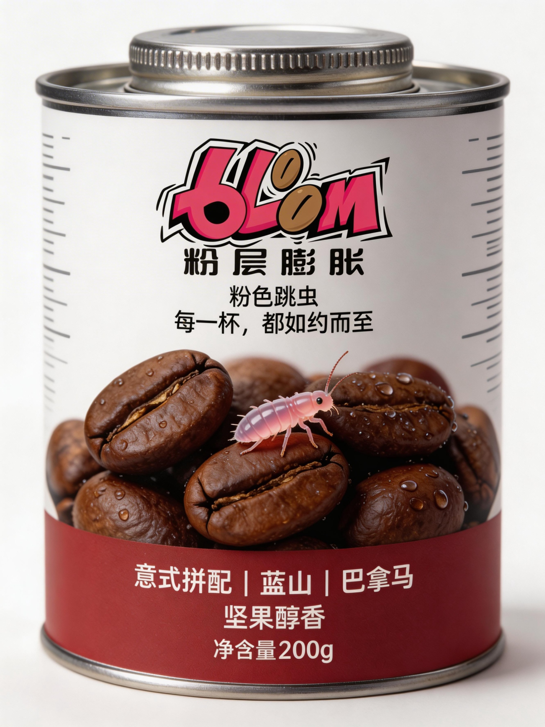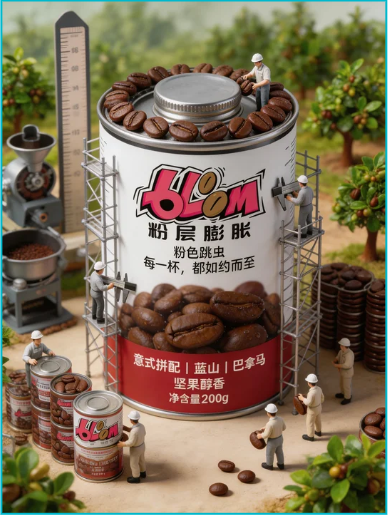 结合「粉层膨胀」的产品信息(品牌名称:粉层膨胀;产品类型:罐装咖啡豆;核心卖点:绝对稳定——批次间风味差异≤5%,每一袋都像复制粘贴;主色调:柔粉色),我们可以直接套用框架,撰写专属包装提示词: