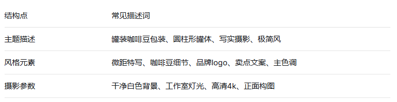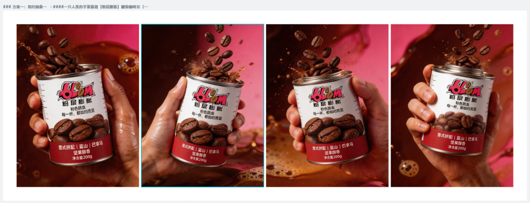 模糊的提示词是AI生成偏差的最大原因。不要只说“粉色罐体”,要明确“柔粉色哑光质感的粉层膨胀罐装咖啡豆”;不要只说“明亮光线”,要明确“工作室灯光,强烈背光,边缘高光”;不要只说“咖啡豆排列整齐”,要明确“粒粒色泽均匀、大小一致,颗粒间几乎看不出差异”。