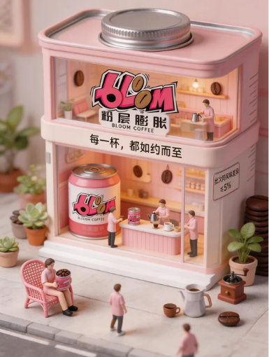 核心逻辑:走极致(场景微缩),将「粉层膨胀」概念店浓缩为3D微缩场景,打造玩具般的可爱质感,拉近品牌与用户的心理距离,适合展示品牌形象、营造理想化的咖啡生活方式,隐性传递“治愈”调性。