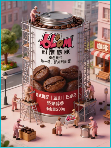外观:极大/极小、极长/极短。比如将「粉层膨胀」的罐体做得极大(微缩场景风格),或把咖啡豆放大到占据整个画面
