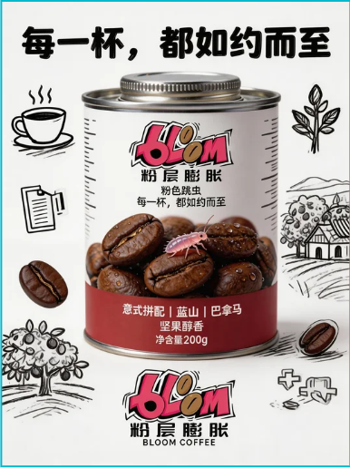 设计思考:涂鸦风格的魅力在于“打破次元壁”。用黑色手绘线条勾勒出一个“复印机生产咖啡豆”的幽默场景,小人拿着放大镜仔细比对两颗豆子——这种轻松幽默的表达,让“复制粘贴”这个卖点变得有趣、有记忆点。黑白为主色调,柔粉色罐体成为画面唯一的彩色焦点,既突出了产品,又传递了品牌的松弛感。