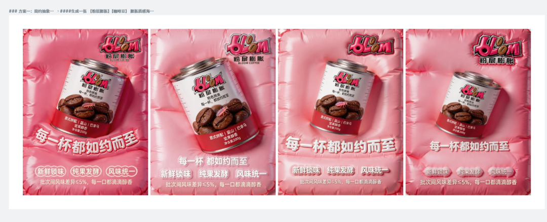 在咖啡赛道竞争日趋激烈的当下,除了产品本身的硬实力,品牌视觉力更是突围的关键。此前,我们已经为新兴咖啡品牌「粉层膨胀」提炼了核心卖点、打磨了品牌文案,并用AI生成了基础的产品场景海报——这类场景海报很好地解决了“代入感”问题,告诉用户“在什么场景下可以喝到「粉层膨胀」的咖啡”。能做到这一步,已经超越了很多新手,但在实际营销中,这还远远不够。
