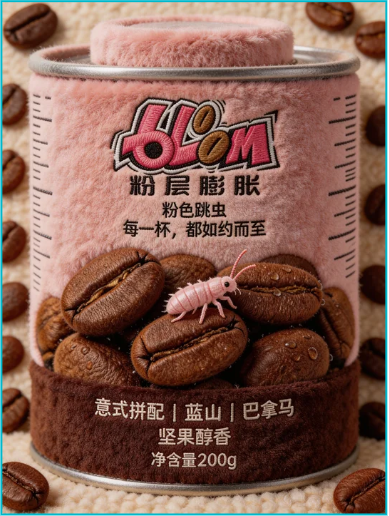 一个带有“粉层膨胀”标识的罐装咖啡豆,整体由鲜艳且蓬松的毛绒织物制作而成,罐身织成哑光粉色,罐面以立体刺绣呈现“粉色跳虫”字样,罐中“倒出”的咖啡豆是一颗颗大小一致、排列整齐的毛绒咖啡豆,每颗豆子的形状、颜色、绒毛走向完全相同,如同复制粘贴,置于同材质的浅米色毛绒背景中央;