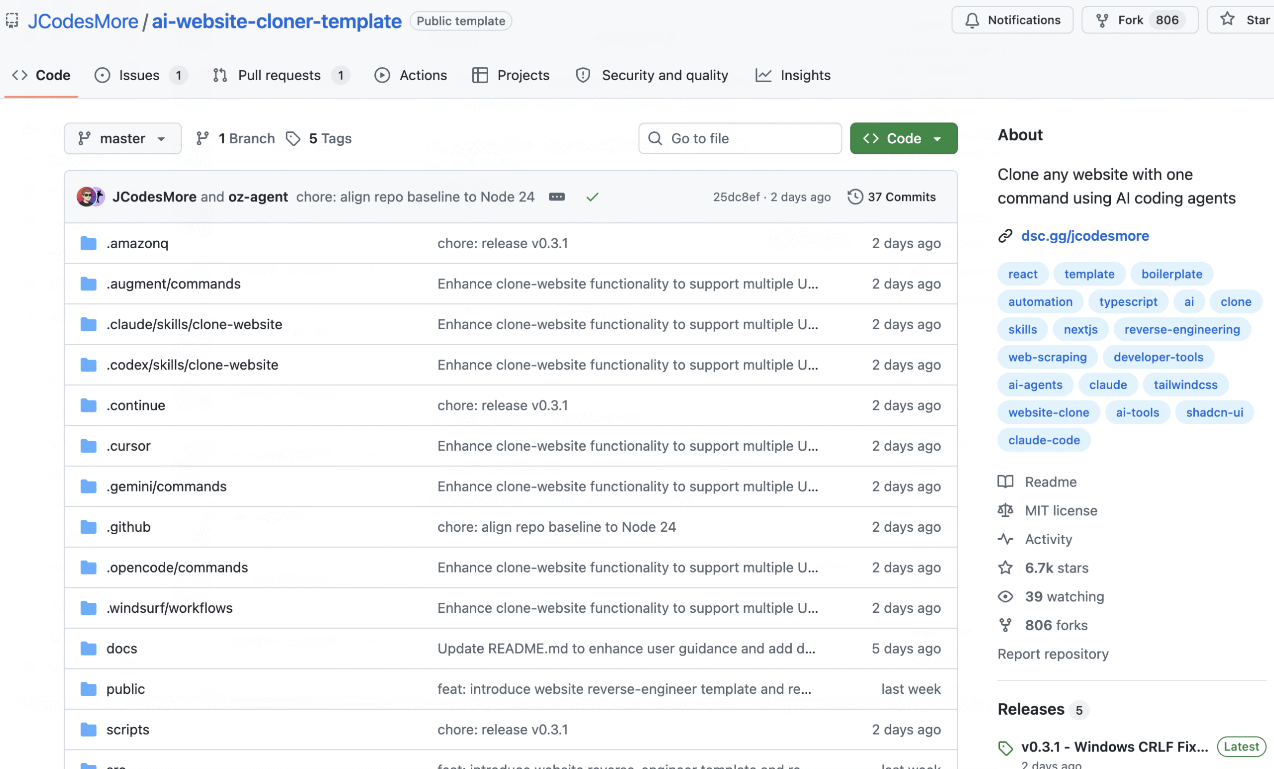 最近在GitHub上发现了一个挺有意思的开源项目——ai-website-cloner-template。这个工具号称能用一条命令把任何网站”克隆”成一个结构清晰的Next.js代码库。说实话,第一次看到这个介绍的时候我有点半信半疑,毕竟逆向工程这种事涉及到截图分析、样式提取、组件重建等等,环节太多了,AI真能一键搞定?但仔细研究了一下项目的设计思路和实现方式,发现它背后的逻辑还挺有意思的。今天就来和大家聊聊这个工具到底怎么样。