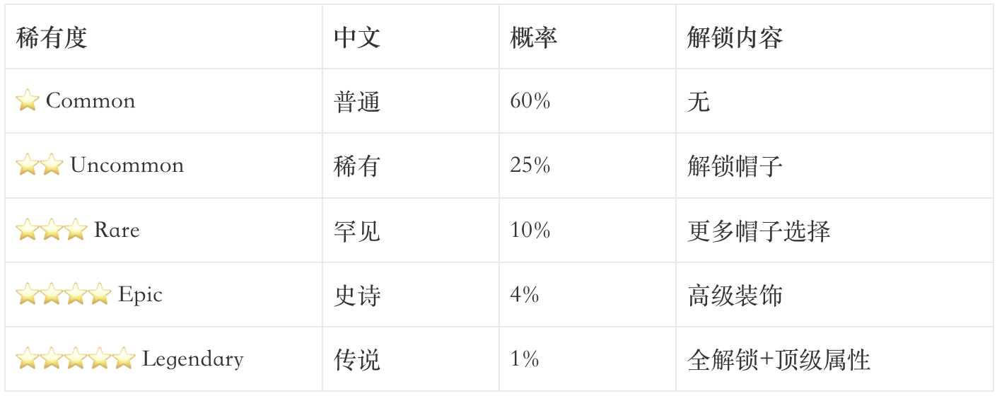 不同稀有度会解锁不同的帽子装饰——普通级别没有帽子,稀有及以上开始解锁礼帽、螺旋桨帽、毛线帽,史诗以上能解锁光环,传说级全解锁加顶级属性值。