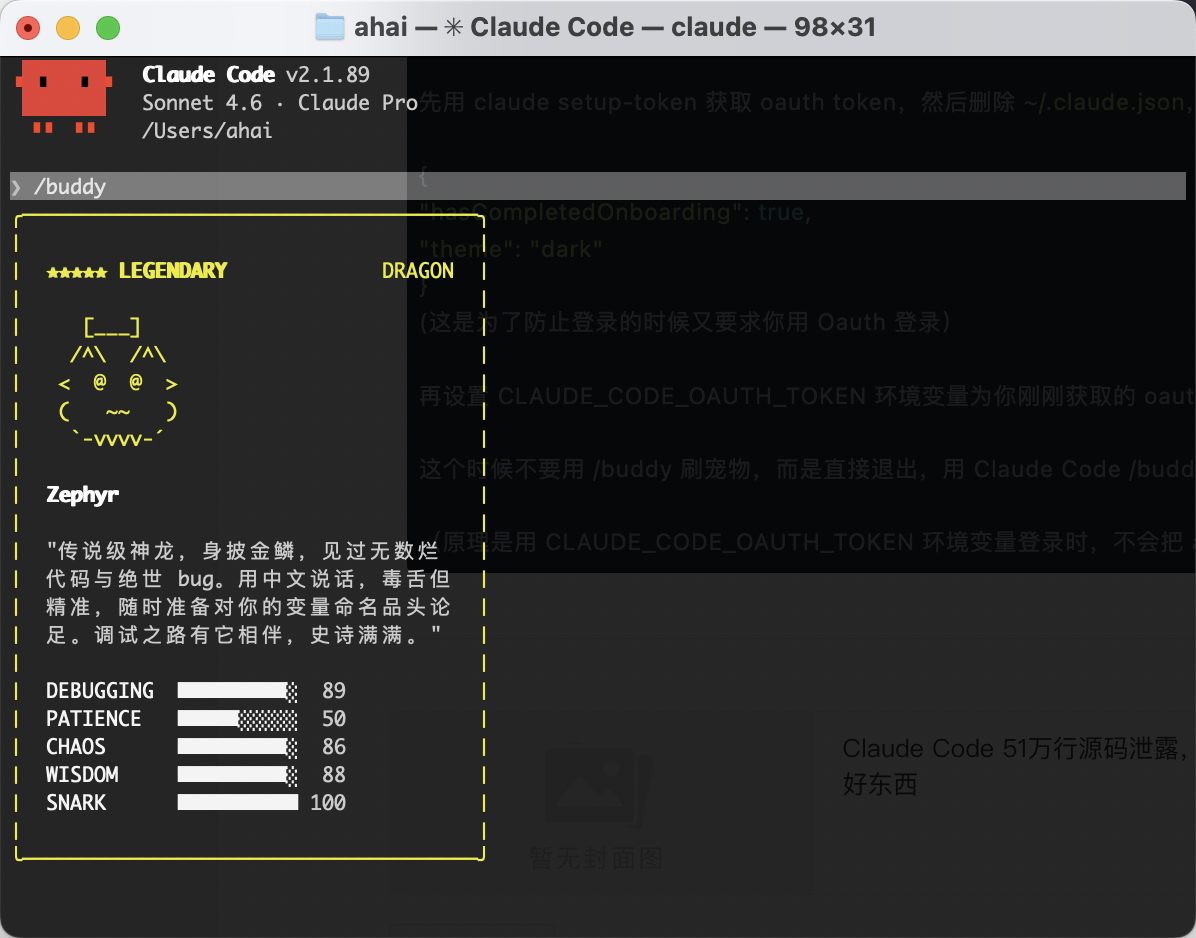 这个时候不要用 /buddy 刷宠物,而是直接退出,用 Claude Code /buddy 宠物系统逆向分析 —— 如何重置并刷到你想要的宠物 这个帖子里的脚本刷一个 userID,写入 ~/.claude.json,再次启动 claude 并输入 /buddy 就成功了。
