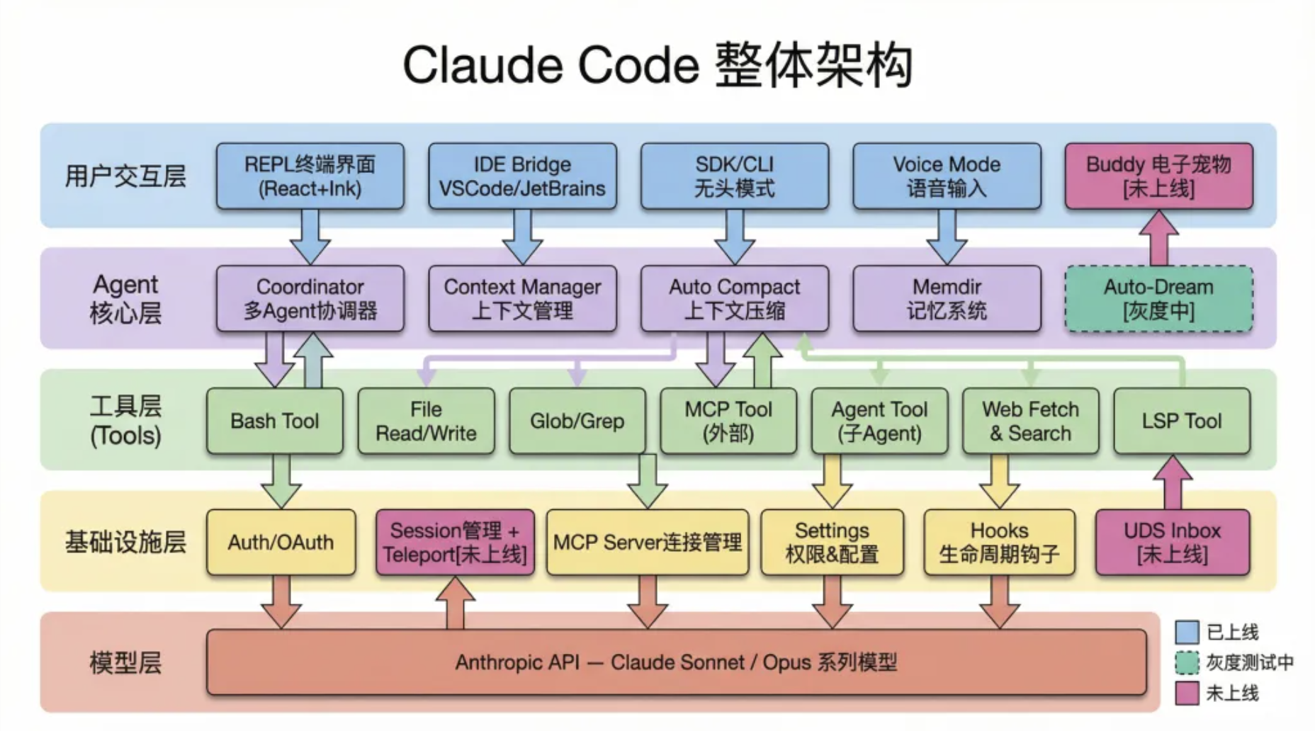 Claude Code 整体架构:五层分层设计,颜色区分已上线、灰度中、未上线功能