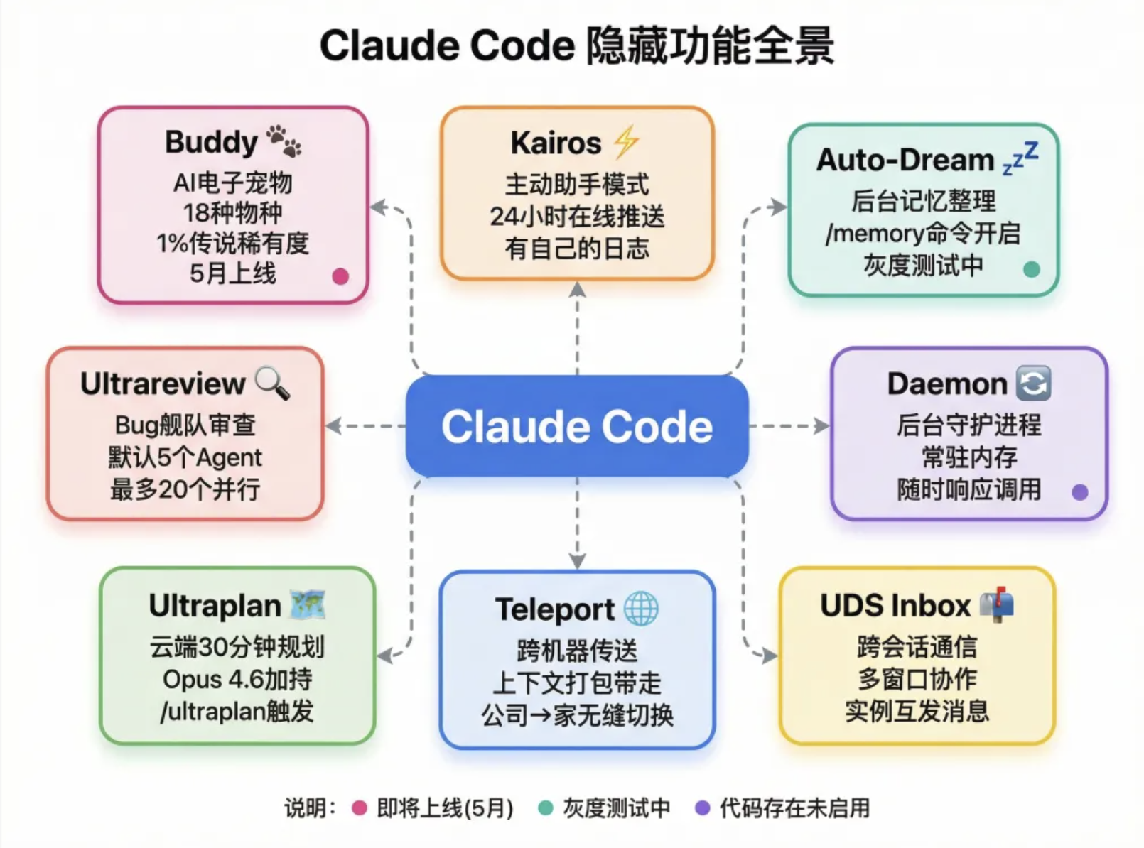你把上面那些功能组合起来想想:Kairos 主动操作你的系统,Daemon 常驻后台持续运行,UDS Inbox 打通多个实例互相通信,Ultrareview 一次性拉起20个 Agent 并行工作,Teleport 把你的完整上下文打包传输……