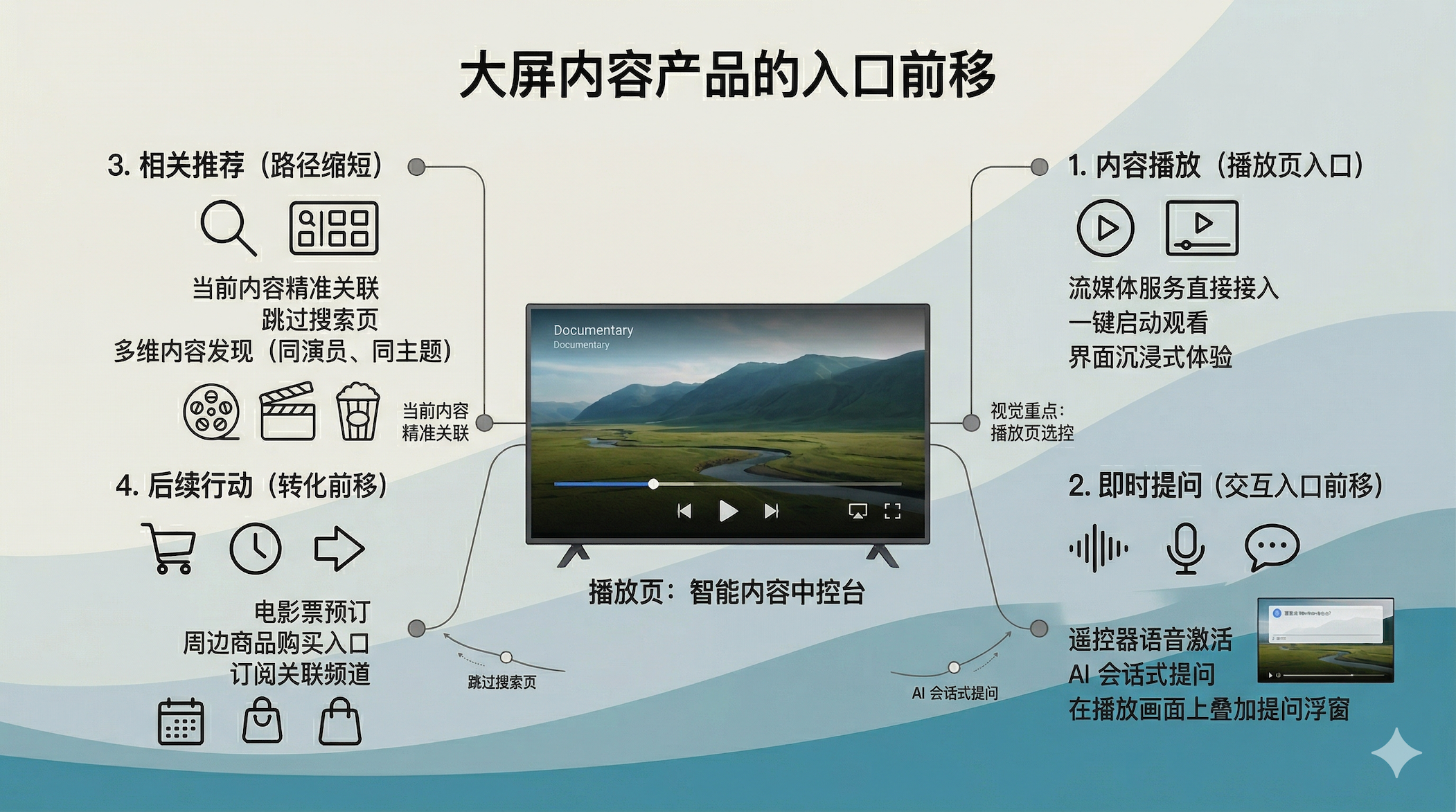 过去 TV 端最重首页分发,未来播放页要承担更多理解、跳转和转化任务。播放页会从“看完即走”变成“边看边决策”。