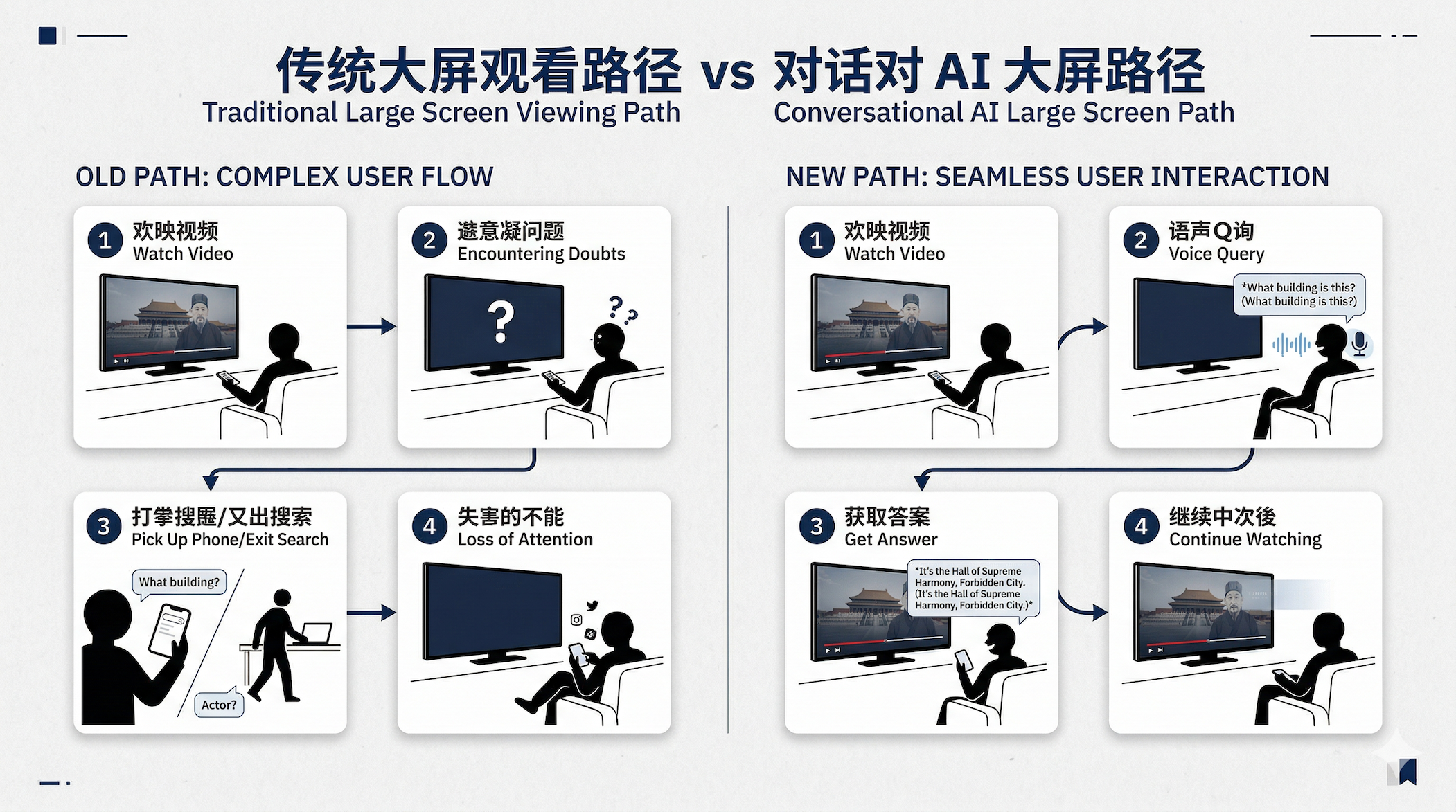 以前很多 TV 用户遇到需求会拿起手机,这对平台来说是一种注意力流失。能在 TV 内完成的理解、发现和轻转化越多,平台越强。