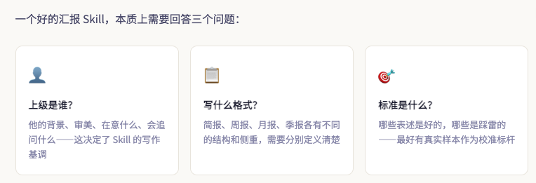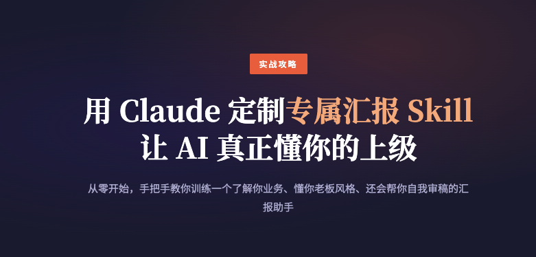 我之前也是这样。直到我花了1小时,用 Claude 的 Skill 功能,定制了一个专属汇报助手——它记住了我领导的审美、我们业务的背景、每种汇报该长什么样,还会在输出初稿后自动站在领导视角帮我审一遍。