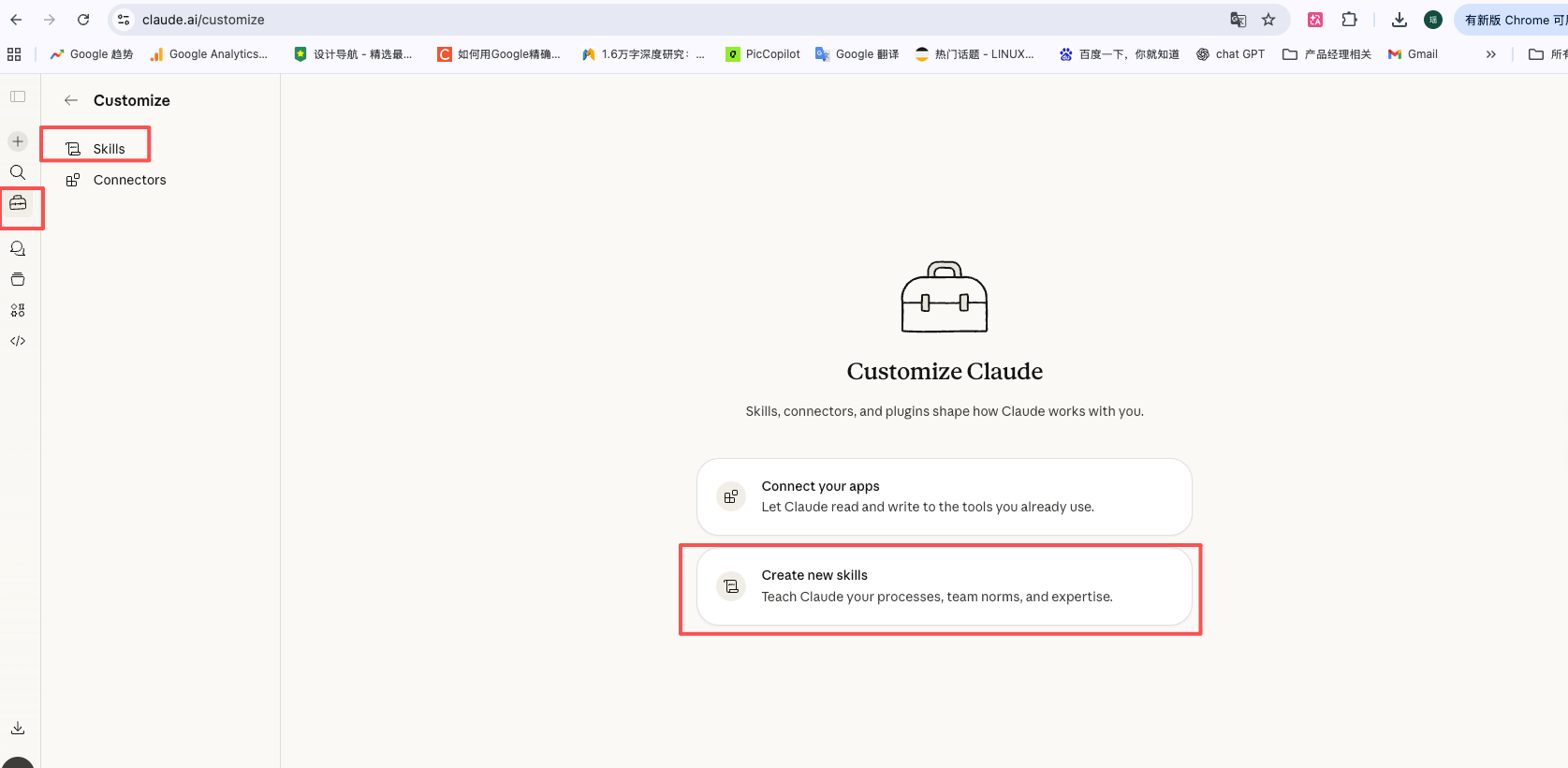 ① 打开 Claude.ai,侧边点击 Customize → 找到「新建 Skills」入口
