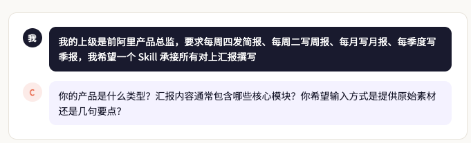 打开 Claude,直接说:「我想创建一个专门写对上汇报的 Skill,帮我设计」。