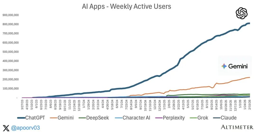 图表一目了然:ChatGPT 那根蓝色的线,像一把拉开的弓,和底下那一团”蠕虫”形成了鲜明的对比。Gemini 是唯一在视觉上能看出来的第二名,大约 2 亿 WAU——这已经很厉害了,毕竟 Gemini 大规模推广也就一年多的时间。但和 ChatGPT 的 8 亿+相比,依然差了 4 倍。