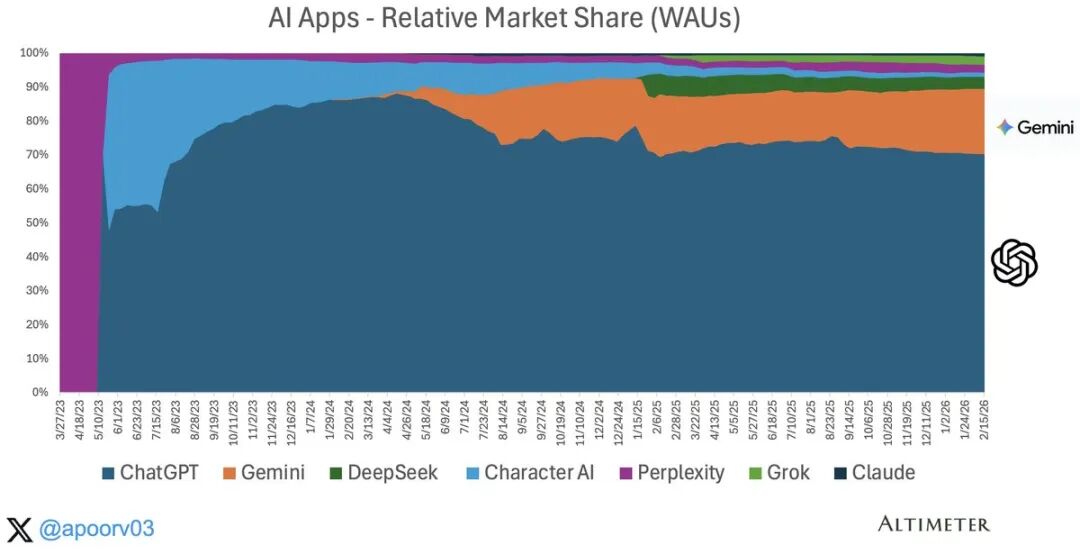 AI 应用相对市场份额(WAU):ChatGPT 稳定占据 ~70%,Gemini ~20%