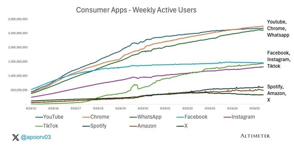 想想看,Spotify 花了 17 年才积累到 5 亿 WAU。Amazon Shopping 花了 20+ 年。ChatGPT 用了不到 3 年就超过了它们。你上次见到增速这么快的消费产品是什么时候?可能是 TikTok。而 ChatGPT 的增长曲线比 TikTok 还陡。