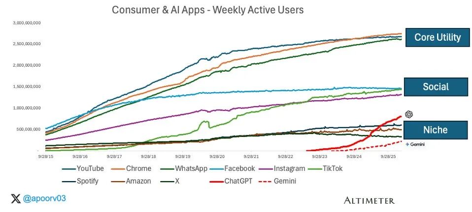 ChatGPT 的 8 亿+ WAU,已经越过了 Niche 梯队的天花板,正在向 Social 梯队逼近。