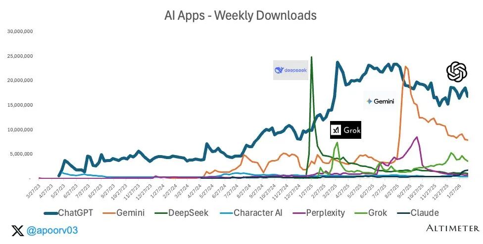 5. 下载量是噪音,留存才是信号。DeepSeek、Grok 等产品在发布时都能制造巨大的下载尖峰,但四周后还有多少人在用?这才是真问题。对于创业公司来说,不要被”首周百万下载”的数字迷惑——看看四周留存吧。