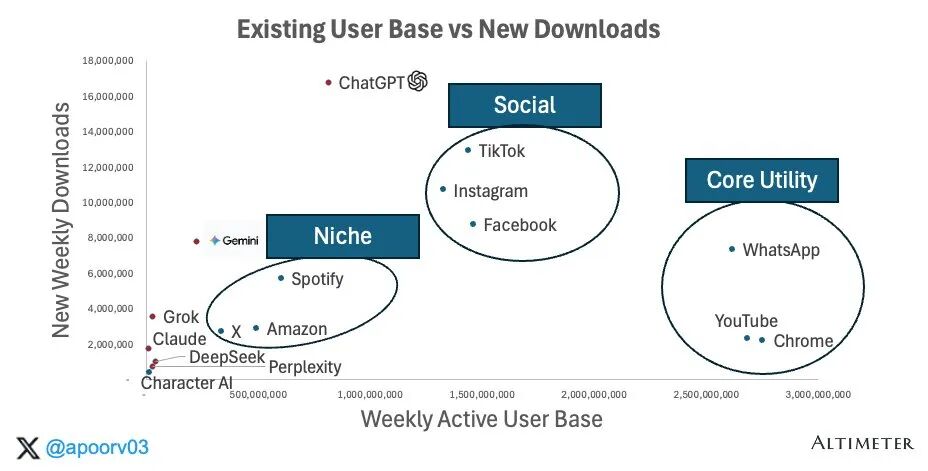 Apoorv 做了一件很聪明的事:他把 AI 应用和传统消费互联网应用放在同一张图上做对比。