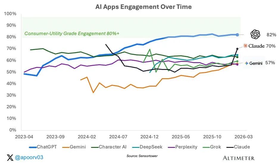 趋势图更能说明问题:ChatGPT 的参与度曲线一直在往上爬,已经逼近”消费级工具”80%+ 的天花板。而其他所有 AI 应用都在 57-70% 的范围内波动,尚未突破。