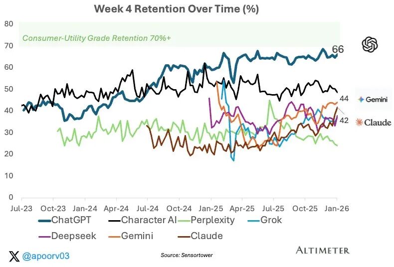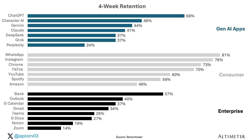 ChatGPT 的四周留存率是 66%,而且还在持续上升。这个数字已经接近”消费级工具”70%+ 的及格线了。Character AI 44%,Claude 和 Gemini 都在 42% 左右。