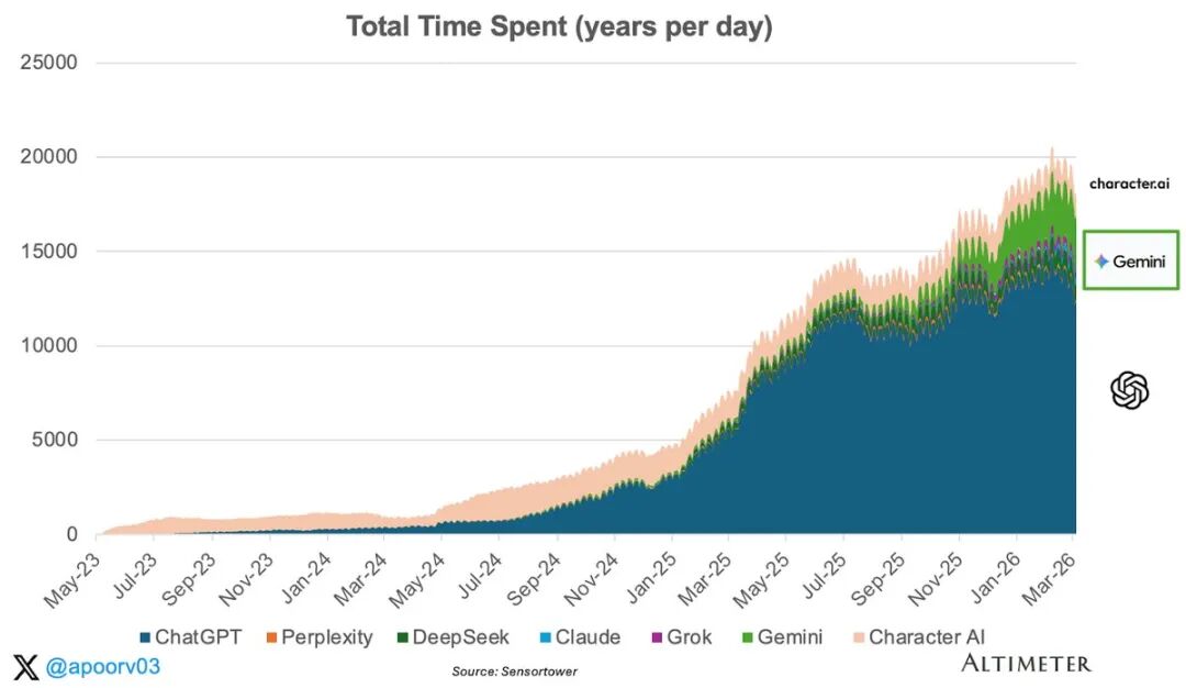 这张图的单位值得注意:”年/天”。是的,所有消费级 AI 应用用户每天总共花费的时间,折算下来接近 20,000 年。ChatGPT 独占其中约 68%,Character AI 和 Gemini 各占一部分。